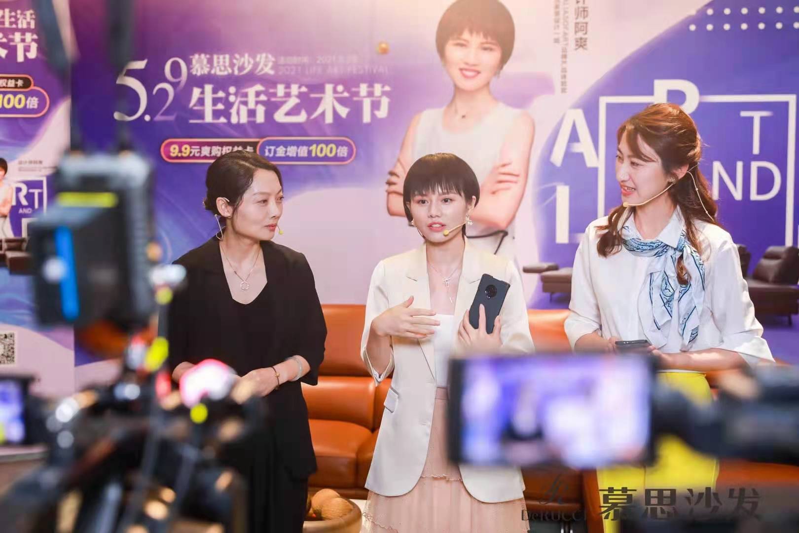 529慕思沙发生活艺术节直播间 左起:慕思集团副总裁盛艳、家居一姐&设计师阿爽、主持人