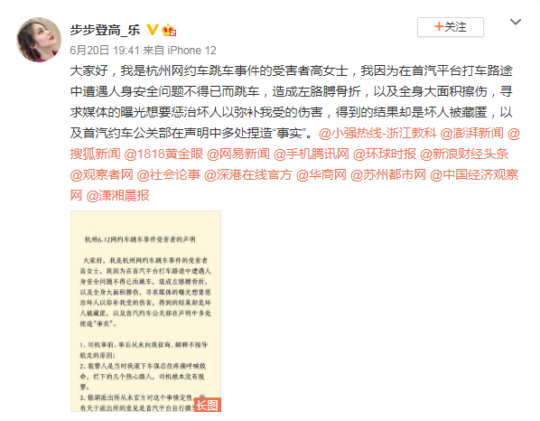 6月20日19点41分,高女士本人通过微博发表声明,详述了自己为何在乘坐首汽网约车时跳车的过程,自称司机企图跟她搭讪,且两次更改路线。越想越怕选择了跳车,导致左臂骨折。