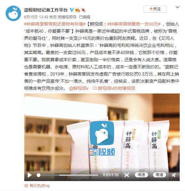 6月15日13点49分,蓝鲸财经发布一段1分35秒的钟薛高创始人的访谈视频。视频中,钟薛高创始人林盛表示:“钟薛高的毛利和传统冷饮企业毛利相比,其实略高。最贵的一支卖过66元,产品成本差不多40块钱,它就那个价格,你爱要不要。我就算拿成本价卖,甚至倒贴一半价格卖,还是会有人说太贵。造雪糕也是需要机器、水电煤、原材料和人工成本的,成本一定是不断涨价的。”