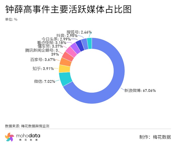 据梅花数据舆情分析,此次活跃媒体分布如下图所示,其中新浪微博为最主要的传播平台,占比高达67.06%,其他平台普遍较低。