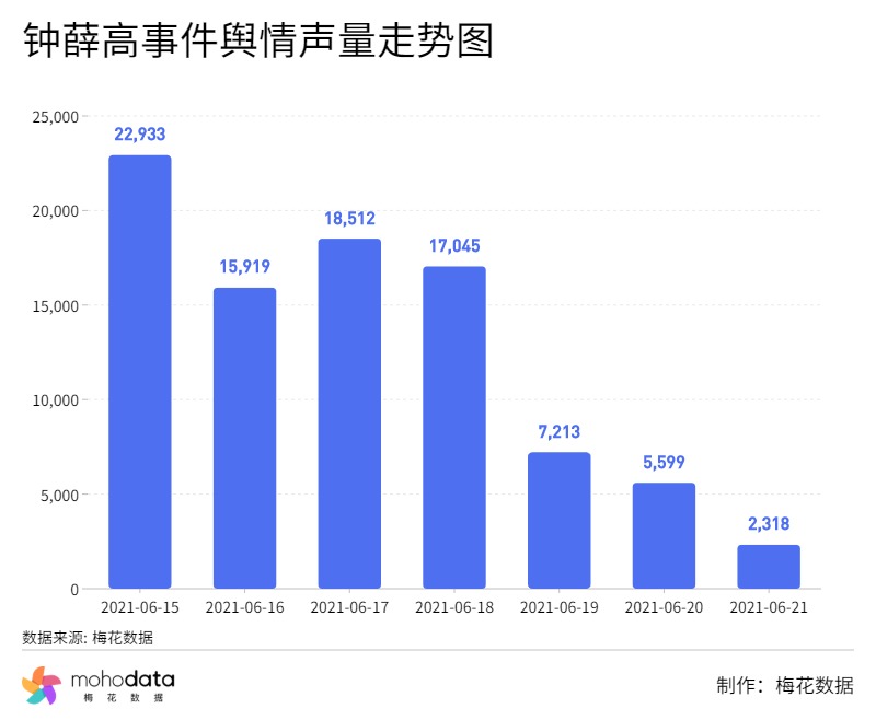 据梅花数据舆情分析,截至6月21日12点,此次事件舆情声量总计89539条,其舆情声量走势图如下图所示,声量在维持了多日较高的热度后才逐步下滑。