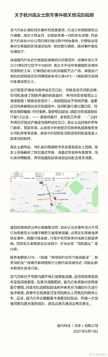 6月19日15点57分,首汽约车官方微博就此事件相关情况发布说明,称首汽约车杭州分公司已将行驶过程中所有录音、行程轨迹等素材交至富阳区银湖派出所,配合警方调查。从录音中并未显示司乘争执或乘客有责令司机停车等迹象,录音中只能听到导航音和司机发现客人跳车时的惊呼。富阳区银湖派出所在调查取证后,初步认为该事件是由于司机与乘客双方沟通不畅而引起乘客误解,进而发生乘客选择跳车事件。