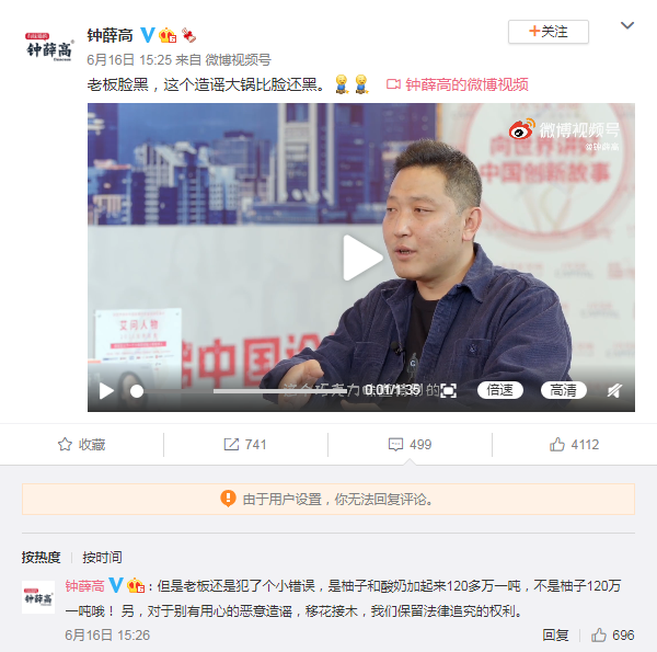 6月16日15点25分,钟薛高官方发布原视频回应表示“老板脸黑,这个造谣大锅比脸还黑。”称视频被恶意剪辑,对于别有用心的造谣,保留法律追究的权利。
