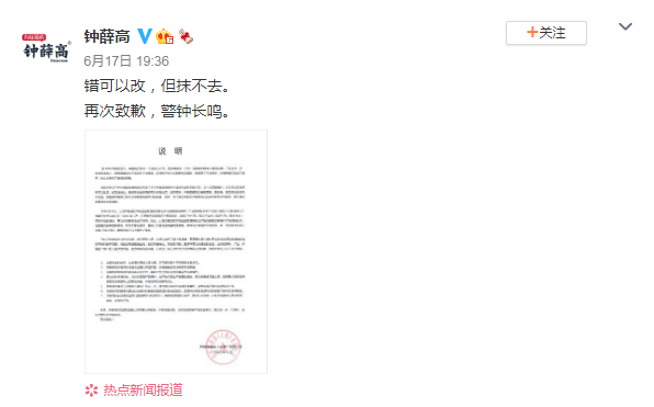 对于被媒体曝光2019年两次虚假宣传的处罚,6月17日19点36分,钟薛高官方微博发布道歉声明:“错可以改,但抹不去。再次致歉,警钟长鸣。 ”