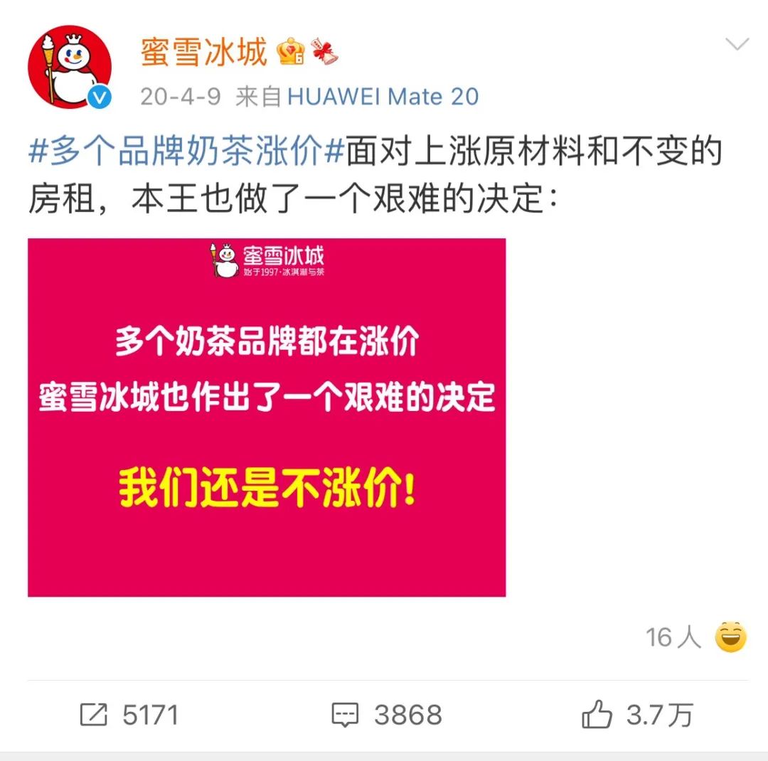 2020年中旬,微博上突然出现一条热搜#多个品牌奶茶涨价#,蜜雪冰城官博快速反应,贴靠热点发布公告,称“作出了个艰难的决定,我们还是不涨价!”