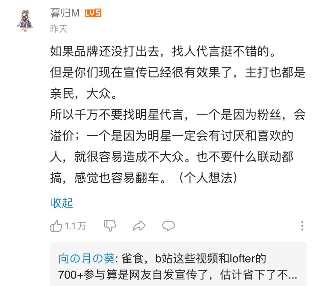 二创文化反哺品牌,吸引路人转粉,加速出圈引爆全网。而作为“文化发源地”的B站,还出现了这样一批为品牌操心的真爱粉,叮嘱蜜雪冰城“加强品控”、“不用找代言人,别溢价”等等~