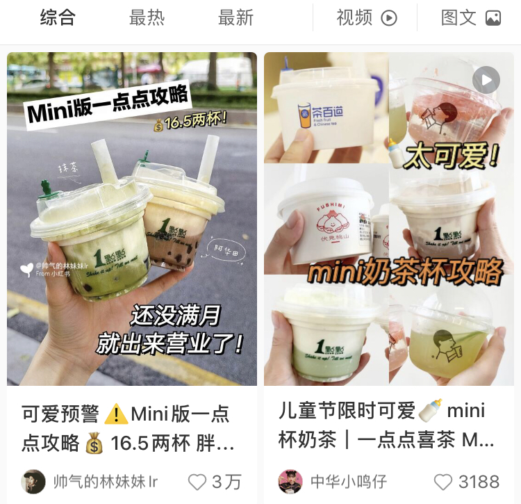 从1点点、阿水大杯茶的“迷你杯”、沪上阿姨的“小宝杯”、书亦烧仙草的“小胖杯”到7分甜的mini版杨枝甘露,纷纷成为年轻人的种草打卡新品。在小红书上,相关笔记已突破2万+。
