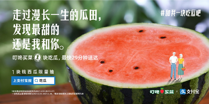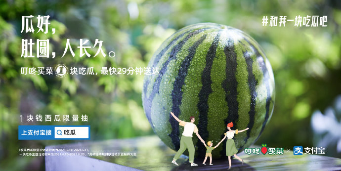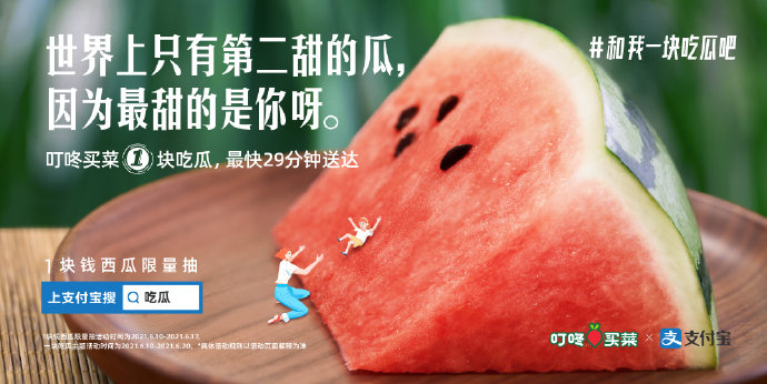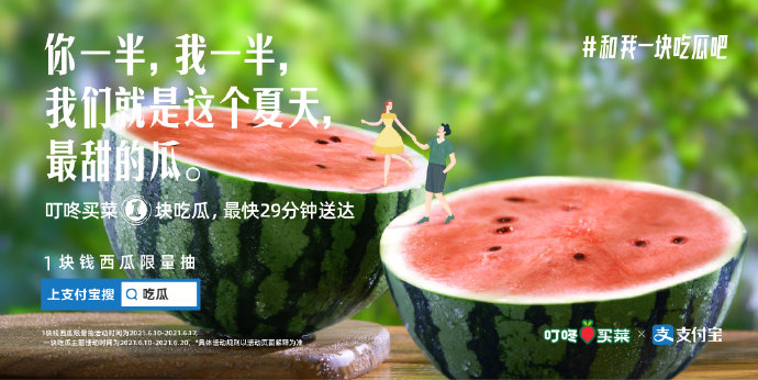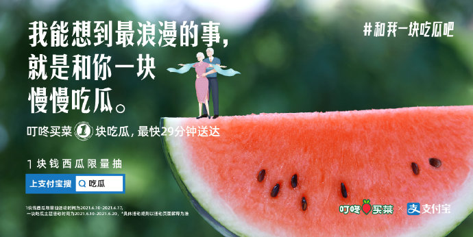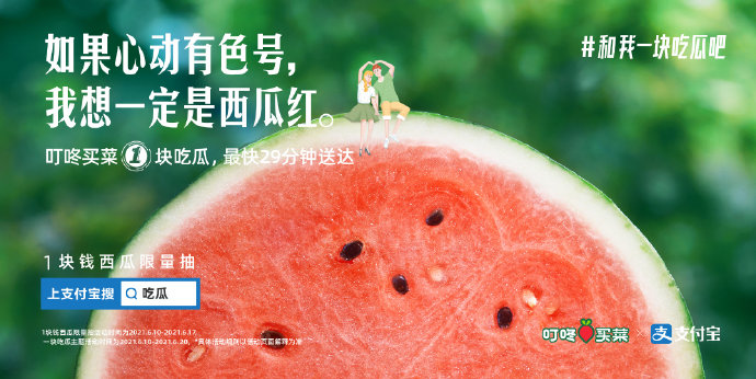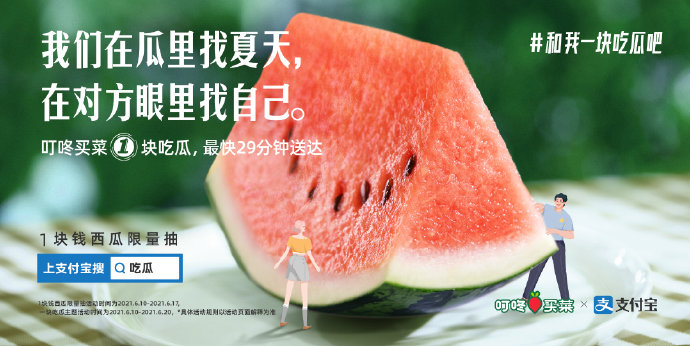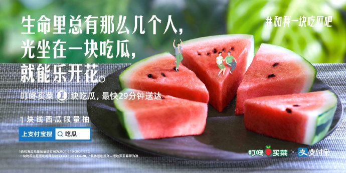 这不,借着夏日的“清凉”气息,以social著称的支付宝变得很文艺,联合叮咚买菜,以典型的夏日元素“西瓜”切入,带来一组甜到冒泡的文案及一支#吃瓜#广告。