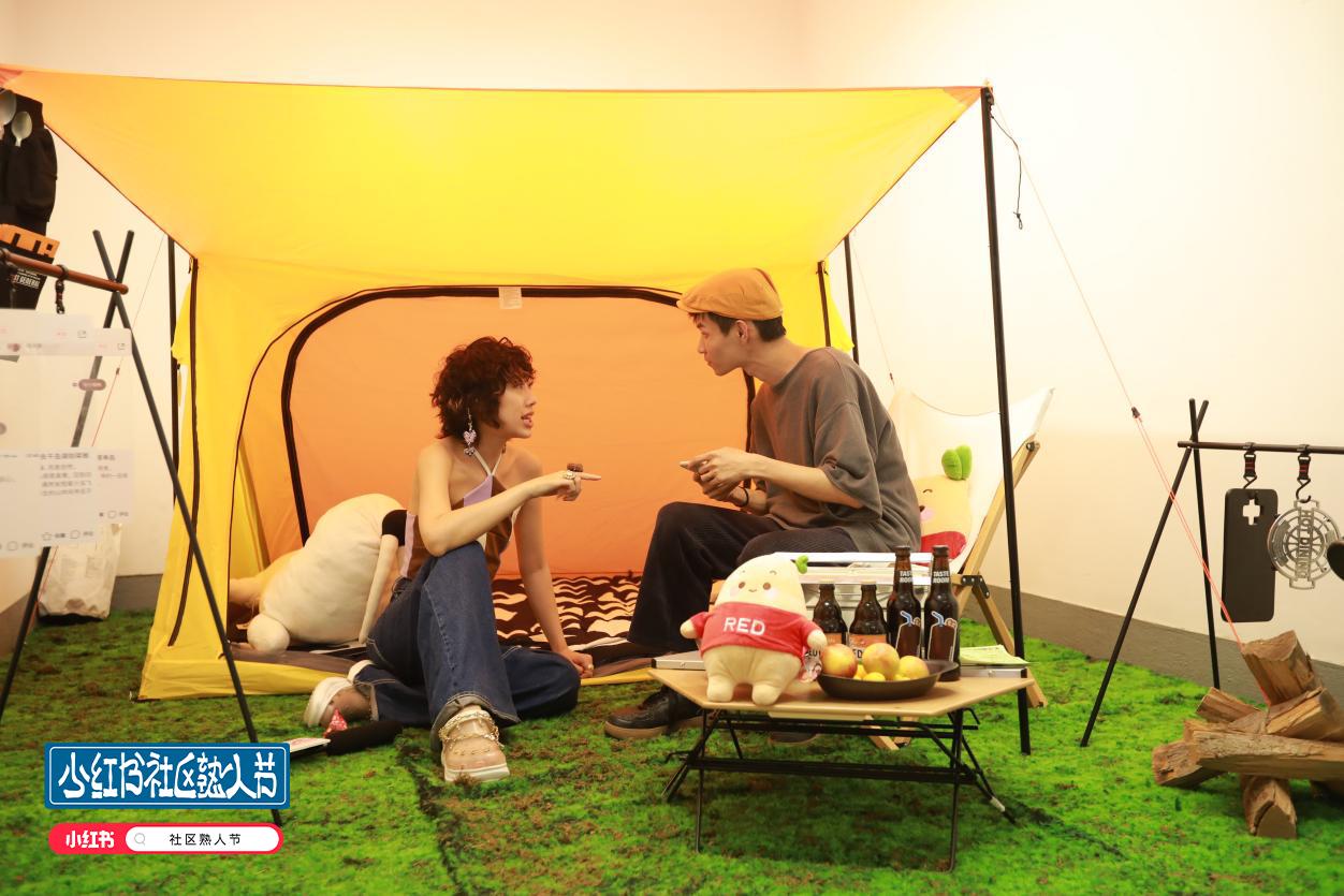在“旅行我熟”空间,作为主理人的小红书旅行作者将帐篷、烤架、小餐桌甚至“草坪”与“天空”都带来这里,把最近小红书上“出圈”的露营体验带进场地。路过的参观者、附近的居民,都可以参与这场小小的“野炊”,因为旅行这个爱好,和来到这里的人熟起来。