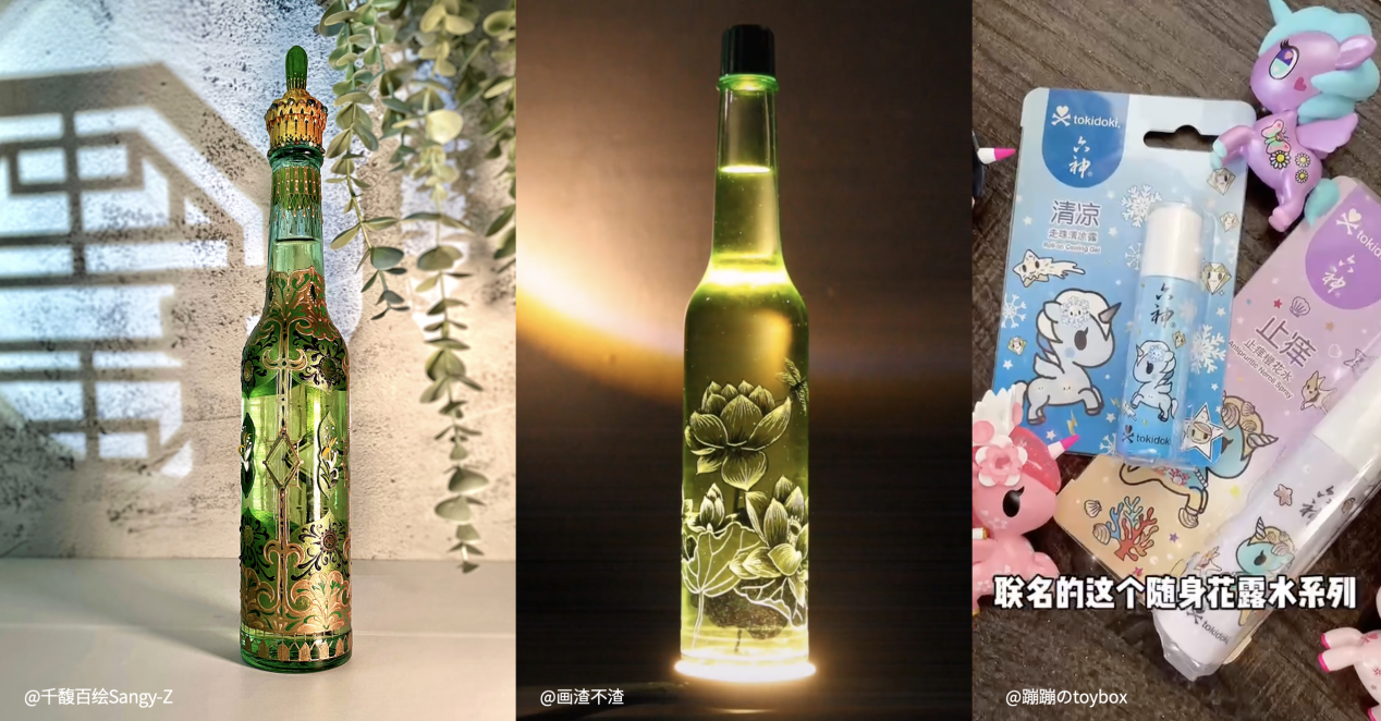 - 艺术、手作、潮玩圈:手作达人@千馥百绘Sangy-Z 神级改造六神经典玻瓶,惊艳众人;@画渣不渣 瓶身刻画,以光影作媒,呈现一片“荷塘月色”;潮玩达人@蹦蹦のtoybox 教科书级示范 “AR扫六神 抽盲卡赢奇运”,种草tokidoki x 六神随身系列。