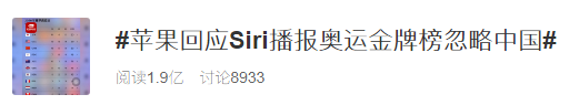 7月28日有网友通过Siri询问奥运金牌榜,结果在自动播报过程中,Siri 依次播报日本、美国、俄罗斯等多个国家,唯独缺了中国。这一消息被做成视频发到了网上,不久后就引来了大量网友围观,并声讨苹果给个说法。