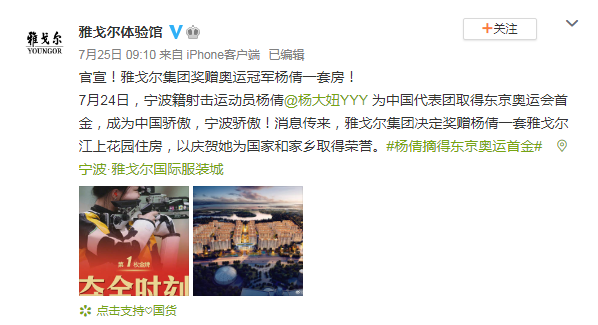 7月25日,雅戈尔集团官宣,决定奖励杨倩一套雅戈尔住房,以庆贺她为国家和家乡取得荣誉。