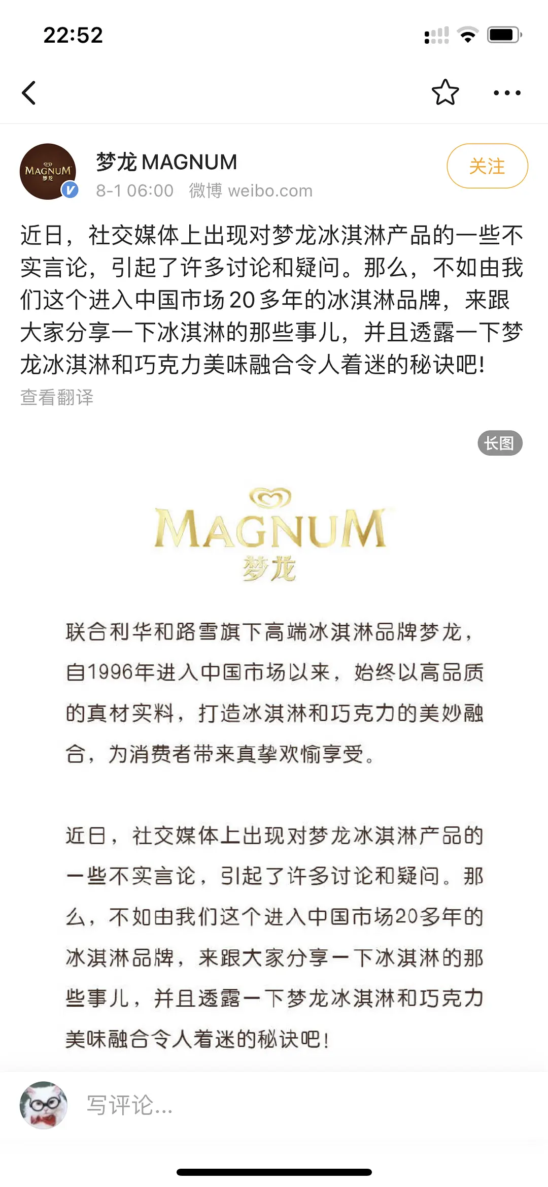 针对网上对梦龙冰淇淋产品的质疑,网传信息显示,梦龙MAGNUM官微于8月1日回应了质疑。梦龙MAGNUM称,根据国家标准GB/T31114对冰淇淋的定义,梦龙产品属于其中的一类一组合型植脂冰淇淋因为梦龙产品是冰淇淋和巧克力的搭配。这里的“植脂”指的是冰淇淋选用了“植物油脂”,并不是指冰淇淋中使用了植脂末。