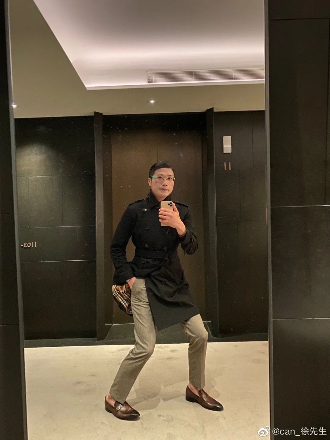 来自徐先最满意的自拍——两条大长腿以奇妙的角度站立,双膝微屈,双膝微屈,右手插口袋正好露出Burberry风衣的一角,固定标志形成万能的copy“模板”。