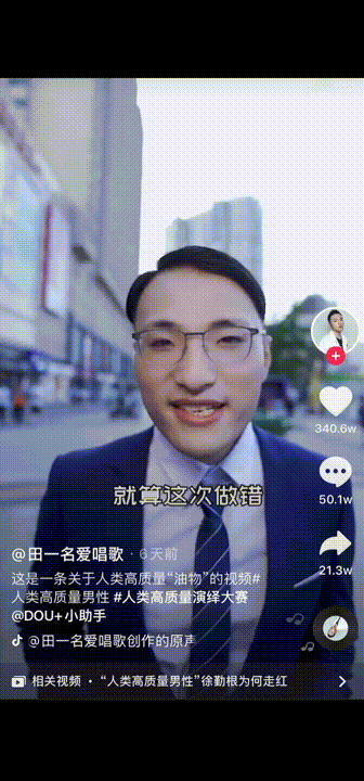 网友中模仿得最成功的要数抖音达人@田一名爱唱歌 ,获赞340万多,被网友评价:十年唱歌无人理,一招油物天下知。