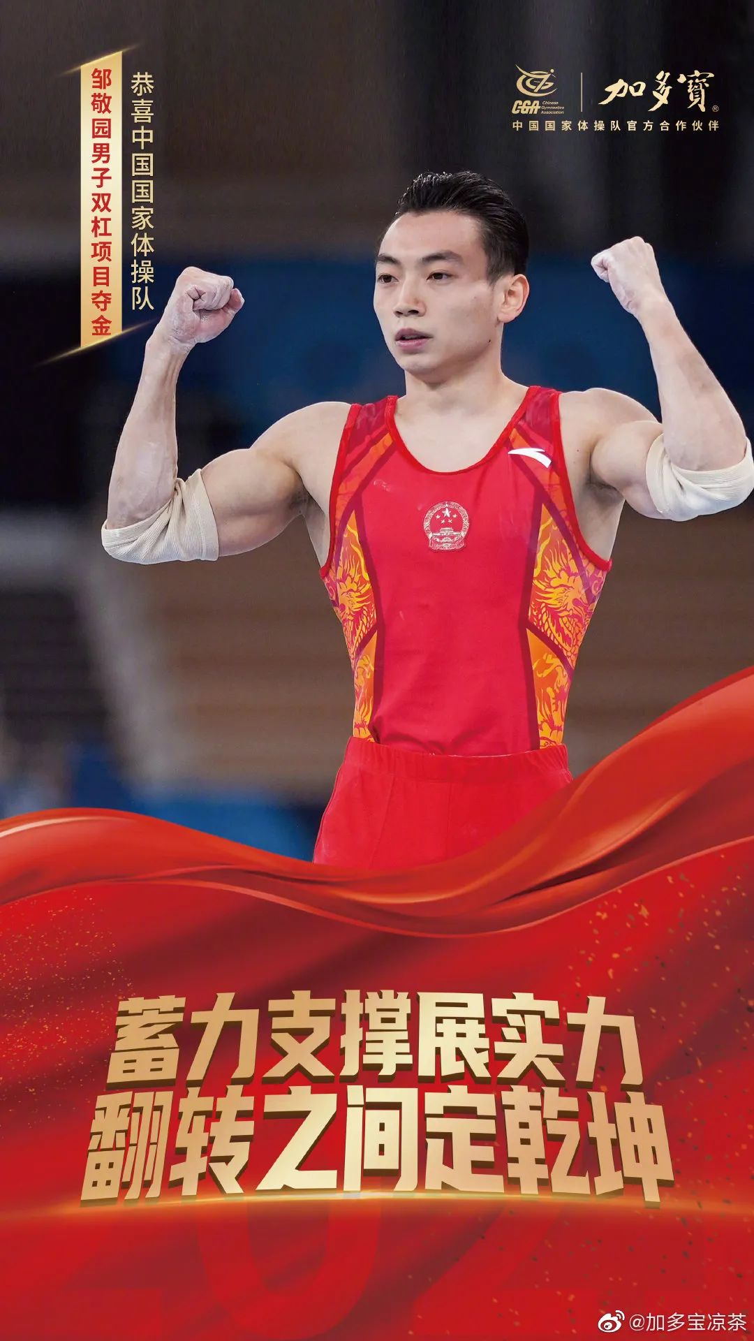 借势背景:邹敬园获男子双杠金牌,振作了团队的气势。