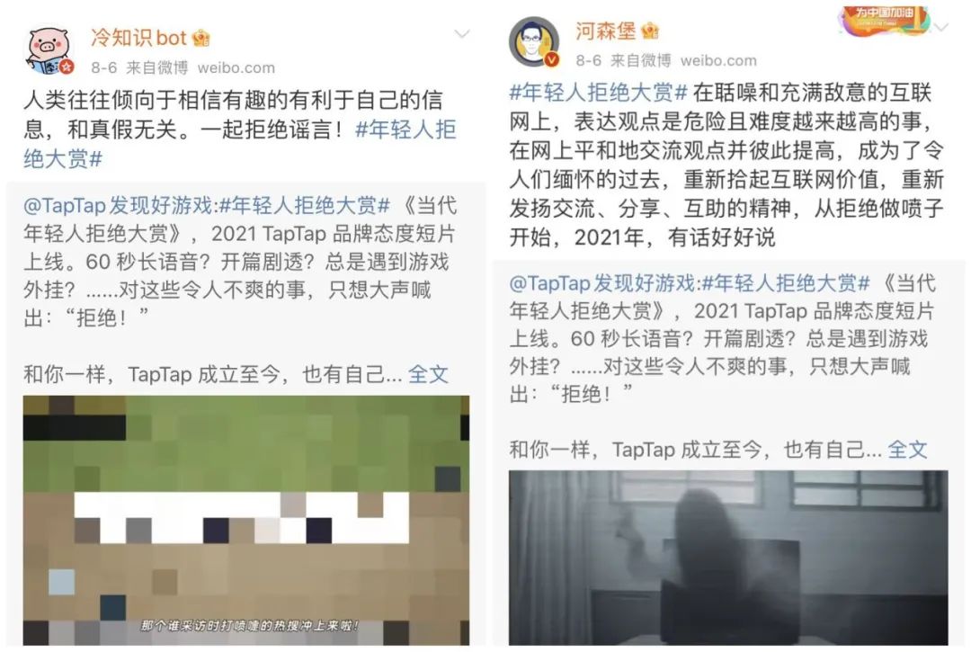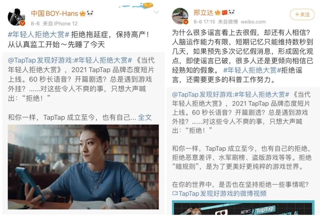 品牌态度短片发布后,TapTap及时承载用户流量和关注度,联动社媒触点和端口,抛出话题#年轻人拒绝大赏#,进一步促进话题发酵,释放年轻一代的自我表达诉求。