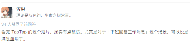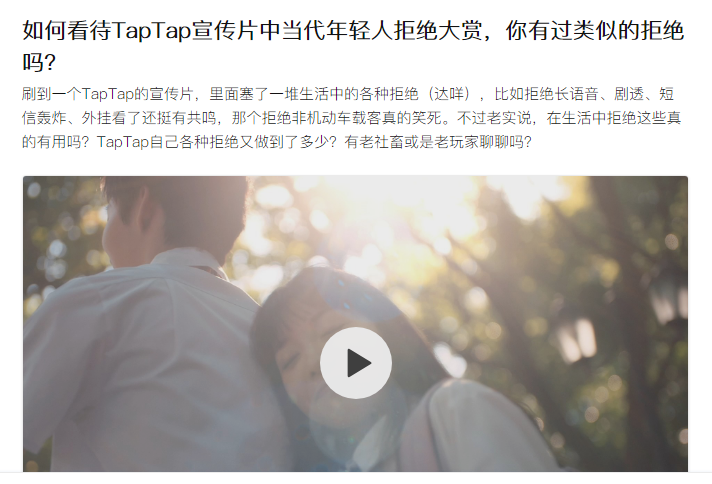 同时,为抢占众多社交平台声量,TapTap还将传播触角蔓延到了年轻人聚焦的知乎平台,发起问题#如何看待TapTap宣传片中的当代年轻人拒绝大赏,你有过类似的拒绝吗?#。问题之下,不少网友留下自己关于职场、生活、社交的真实体验,为活动带来持续的二次曝光效果。
