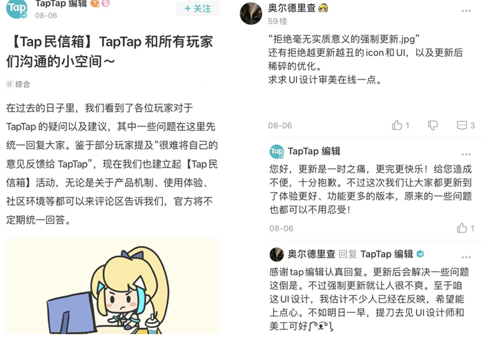 此外,非常重视社区主战场的TapTap,还在站内及时开展“Tap民信箱”活动与,站外传播形成协同效应。通过收集用户问题+官方回答形式,TapTap积极缩短与站内用户的沟通路径,消除平台和玩家的沟通隔阂。