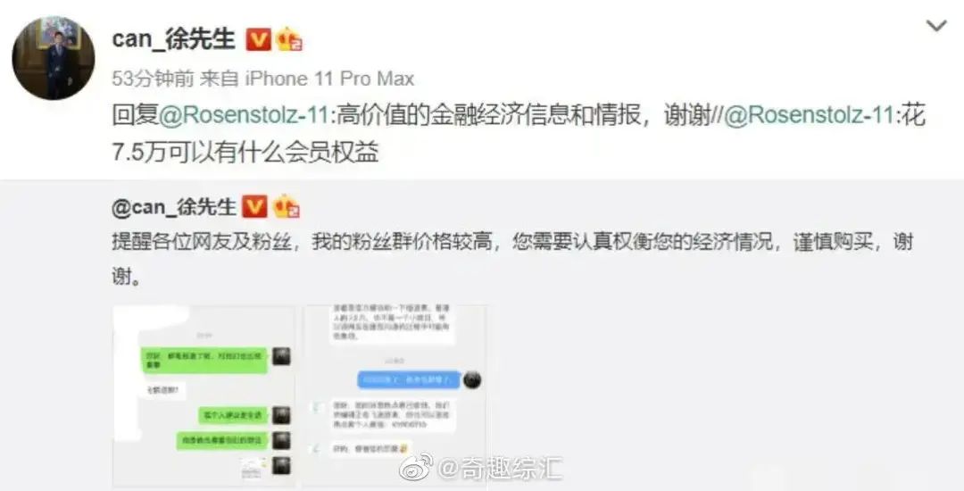 不过,这几天也发生了一个小插曲:有女粉丝头脑一热加入了徐先生的微博粉丝群,随即该女粉丝的男友要求退款退群。没想到入群包年要付7.5万元的巨款!