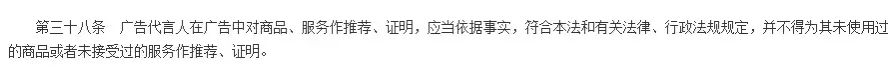 另据广告法第三十八条规定:……不得为其未使用过的商品或者未接受过的服务作推荐、证明。