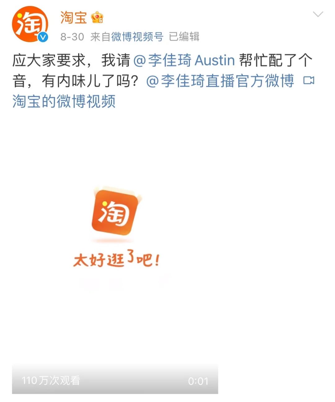 此外,淘宝官博还与粉丝积极互动,先是接梗“自带语音的slogan”,找来李佳琦配了一段音频。