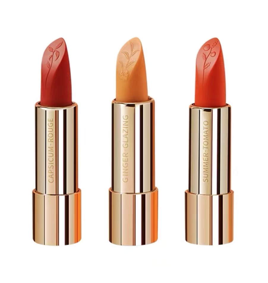 海底捞做了三款口红,如下图,分别取名“红颜·椒”、“黄闪·姜”、“夏日·番”,对应食物辣椒、生姜和番茄,产品中也添加了相应的成分。
