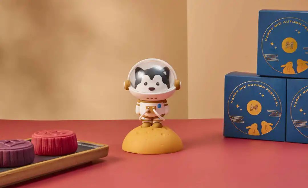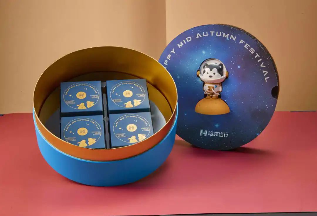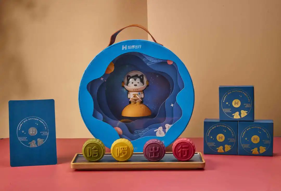 哈啰出行打造了一个“深邃星球”模样的中秋礼盒,四块流心月饼包围着一只太空探月哈士奇。