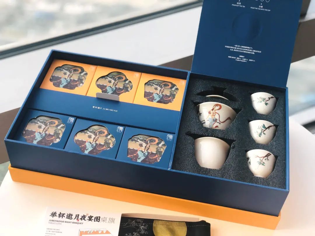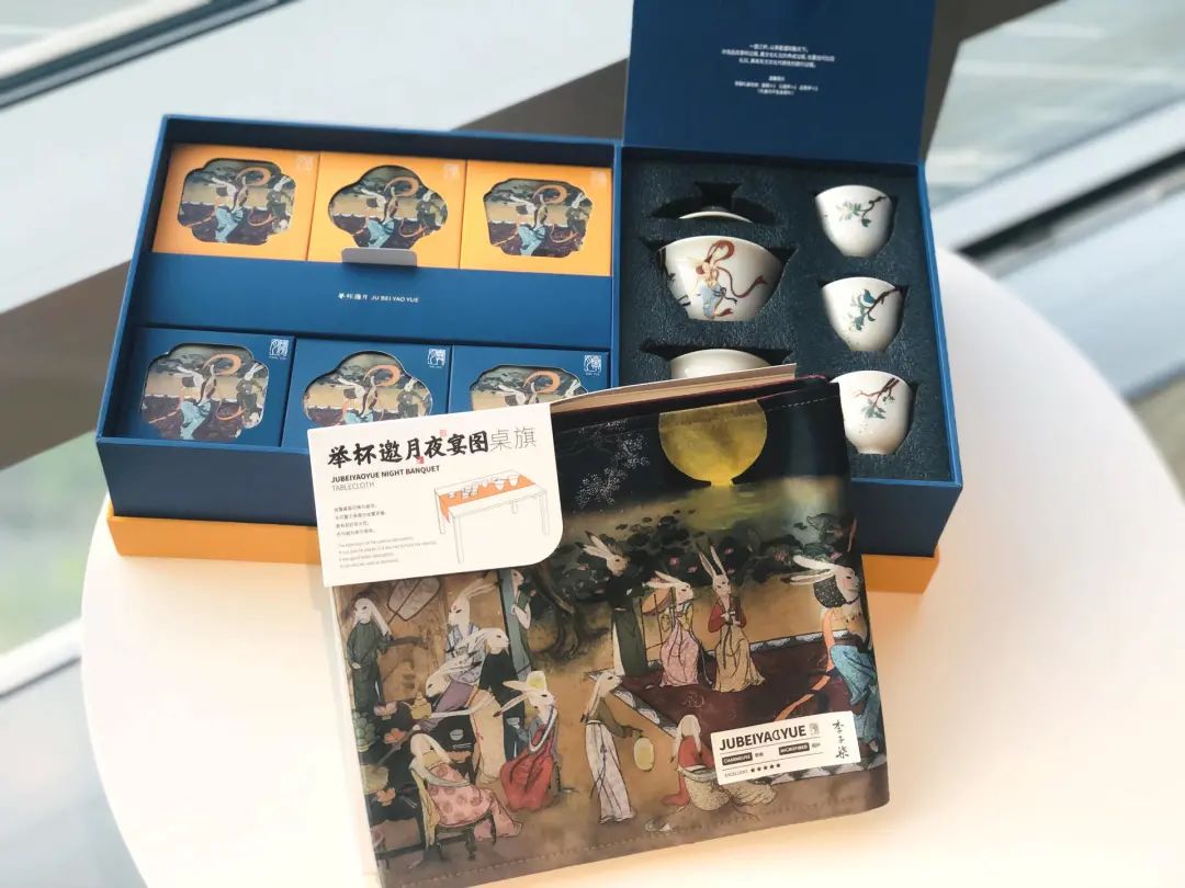 李子柒的【举杯邀月】礼盒,外观是一幅兔仙版夜宴图,礼盒内还有兔仙夜宴版桌旗和一套精美的茶杯套装,并装有6枚不同口味的月饼,东方味十足。