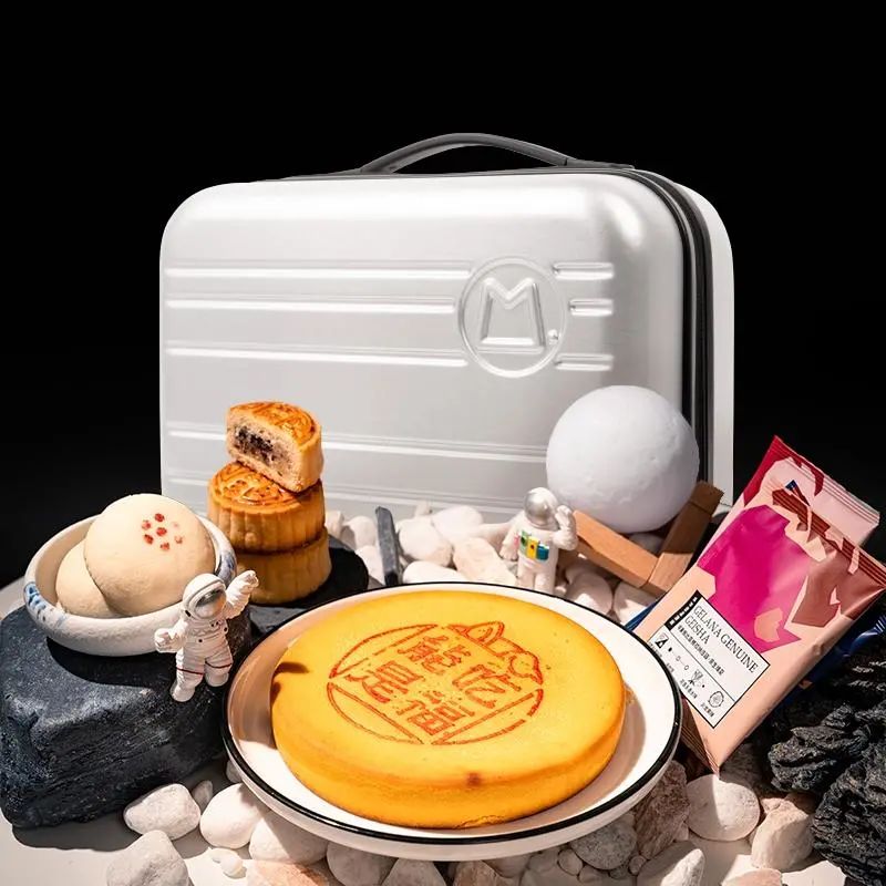 月饼、跳棋、置物盘,以朦胧质感亚克力手提箱的包装形式组成了“月光礼盒”。