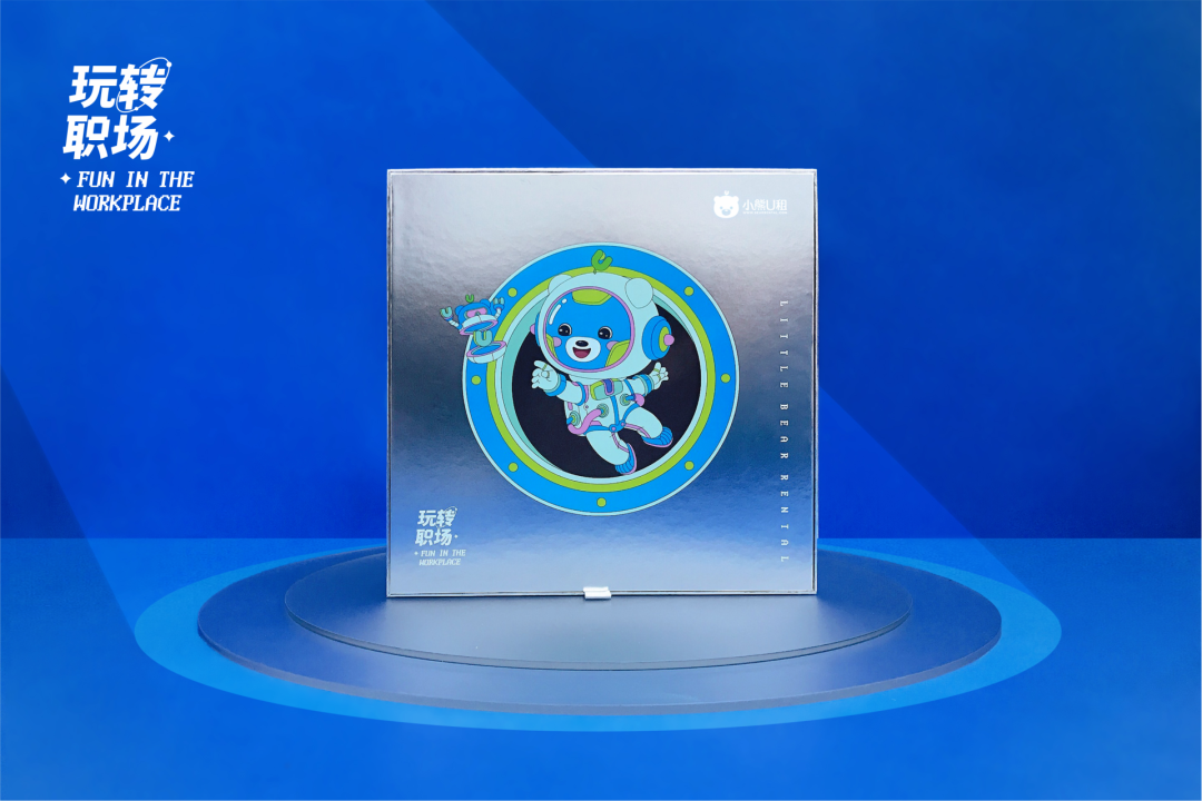 礼盒以身着荧光太空服的小熊和UU机器人为主形象,辅以太空舱、飞船、月球场景画面增强太空氛围,银色镭射质感凸显未来感~