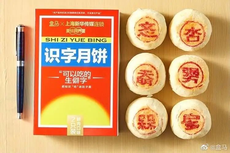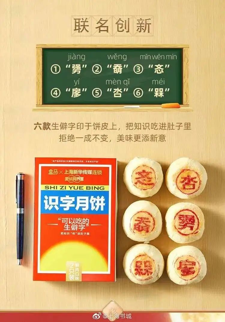 盒马与上海新华传媒合作,推出【识字月饼】礼盒,在饼面上印生僻字,不仅喂你吃的,还要给你科普读法和释义。