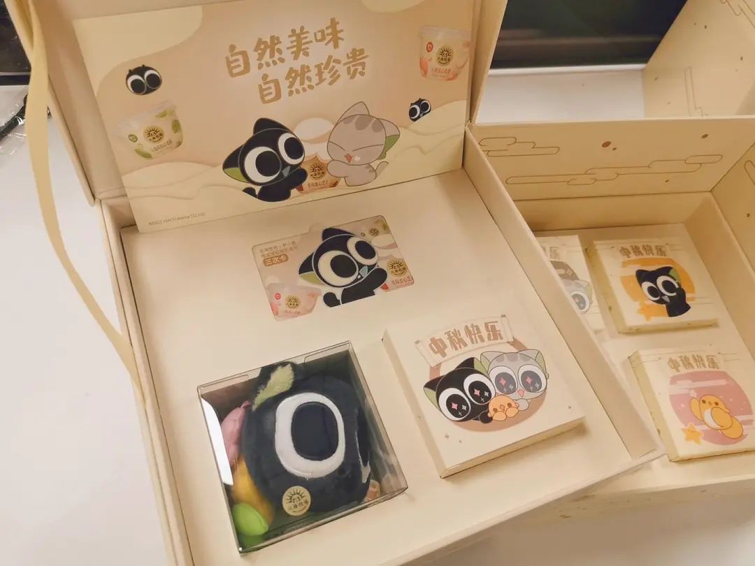 盒内的中粮月饼以及罗小黑毛绒挂件颜值超高,精致可爱,看得小花也星星眼啦~
