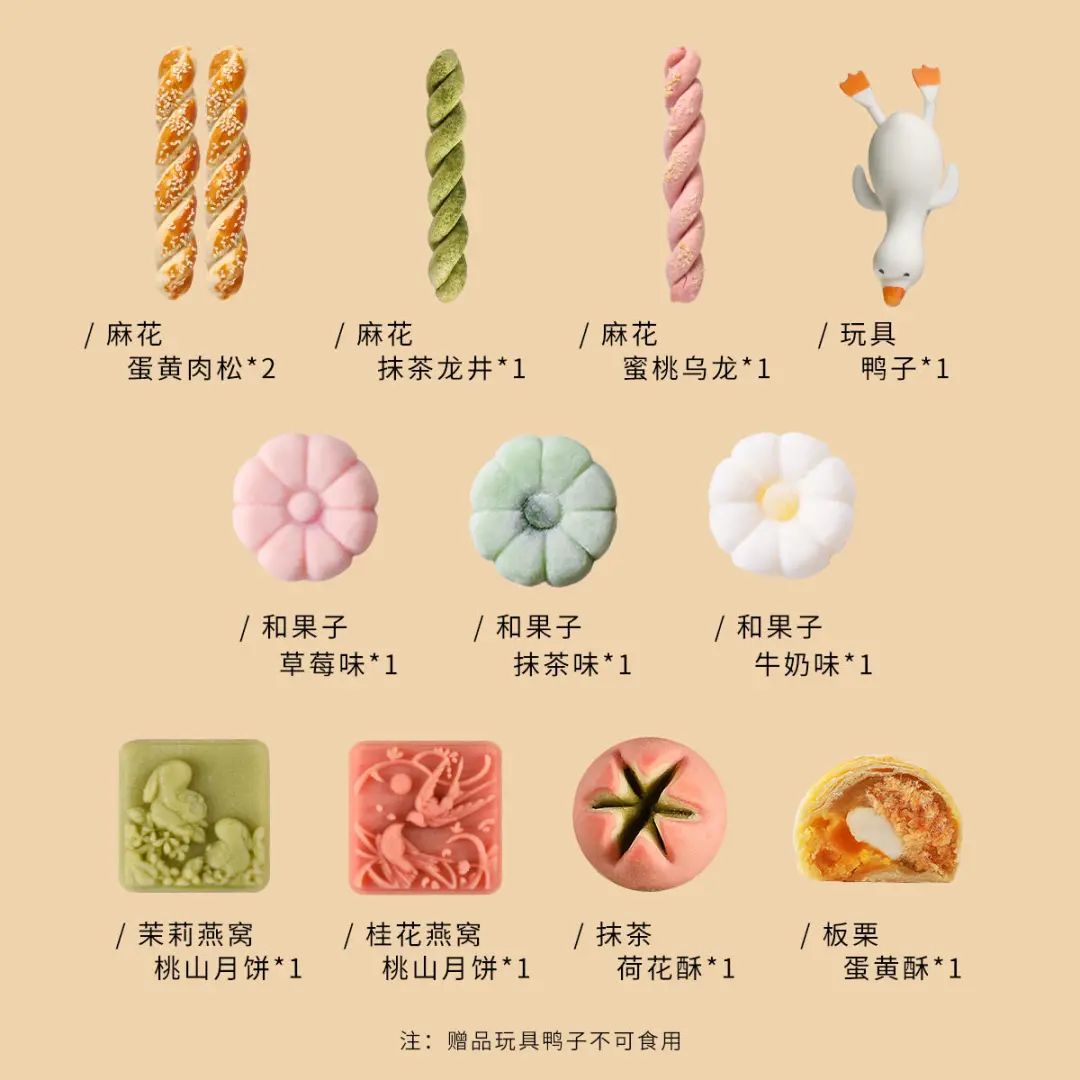 盒内含五种创新口味的月饼各一枚(玉兔奶黄、神仙小黄蟹、总统黑松露、燕窝雪媚娘、纯欲提拉米苏)、自家产品和玻玻兔定制书签三枚。