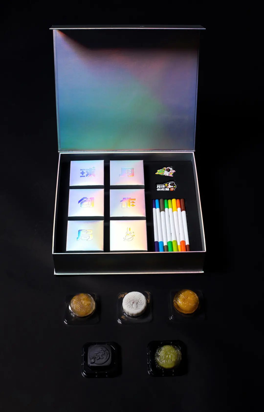 礼盒中,除了六枚月饼外,还包含一个月球创作灵感包,一张涂色卡及彩笔、两个小影酱中秋限定冰箱贴。
