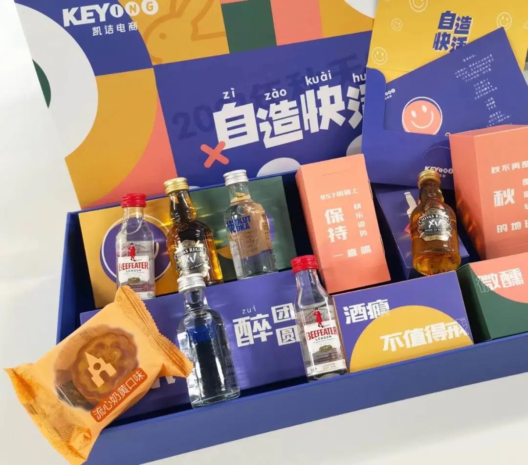 凯诘电商推出礼盒【自造快活】,将“便利店调酒”和流心月饼跨界组合,拆盲盒拆出微醺快乐~