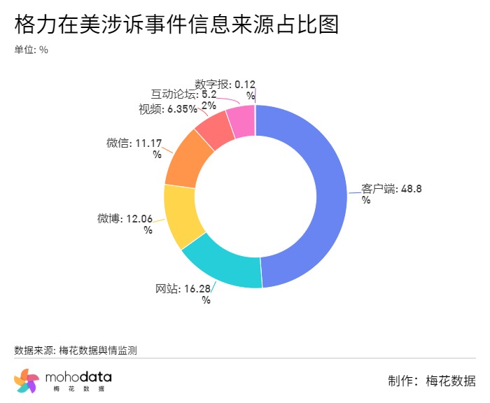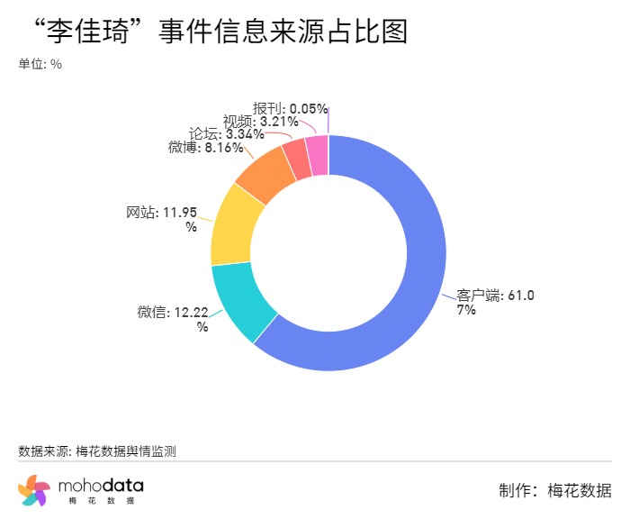 其中信息来源分布图如下图所示,声量主要集中在客户端,占比48.80%,网站占比16.28%,微博占比12.06%、微信占比11.17%,其他信息来源占比不超过10%。
