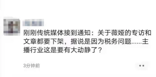 而此前一张写有:“刚刚传统媒体接到通知:关于薇娅的访谈和文章都要下架,据说是因为税务问题”的朋友圈截图在业内流传。