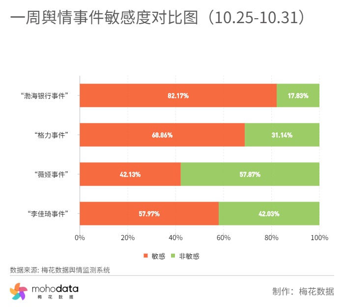 根据梅花数据舆情监测系统监测,在10月25日-31日,此事件共监测相关舆情声量总计22181条,敏感度82.17%。