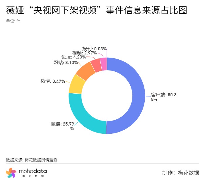 其中信息来源分布图如下图所示,声量主要集中在客户端APP,占比50.38%,微信占比25.79%,其他信息来源占比不超过10%。