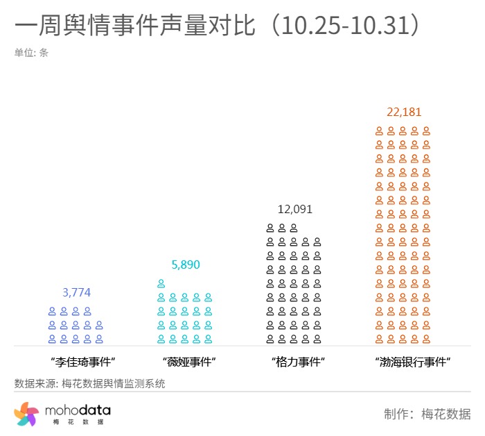 舆情声量方面,上周的主要负面舆情当中,“渤海银行事件”声量最高,监测期间内共监测到22181条舆情声量,“格力事件”声量为12091条,“薇娅事件”舆情声量为5890条,“李佳琦事件”舆情声量最少,为3774条。