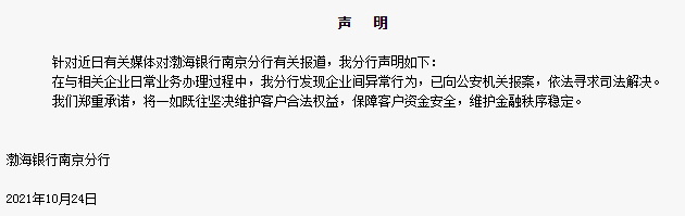 渤海银行于10月24日发布声明称:针对近日有关媒体对渤海银行南京分行有关报道,我分行声明如下:在与相关企业日常业务办理过程中,我分行发现企业间异常行为,已向公安机关报案,依法寻求司法解决。我们郑重承诺,将一如既往坚决维护客户合法权益,保障客户资金安全,维护金融秩序稳定。