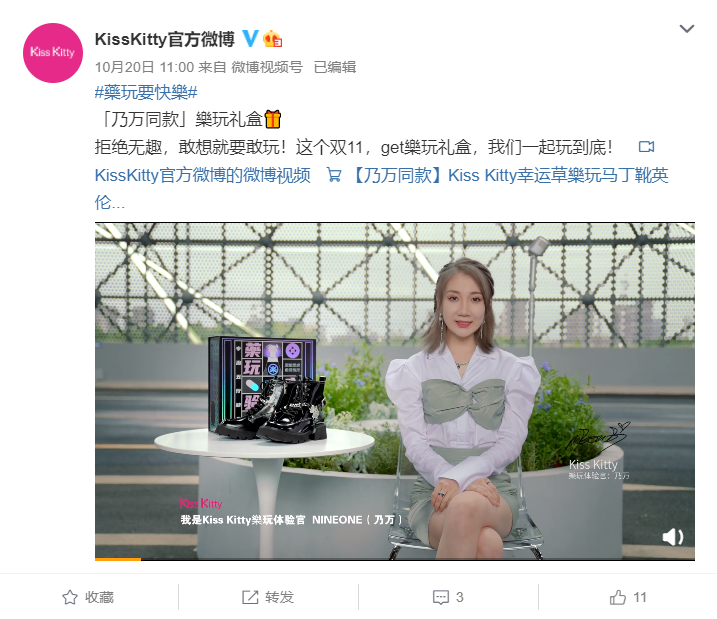 今年9月底,Kiss Kitty邀请乃万为秋冬新品上市拍摄TVC态度大片,为双11蓄水造势。不仅在短期内迅速引爆新品口碑,而且通过更精细化、多元化的运营策略,成功构筑从声量到销量的良性闭环,也引发了我们的关注。