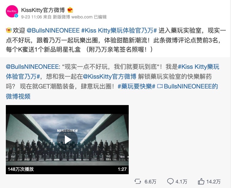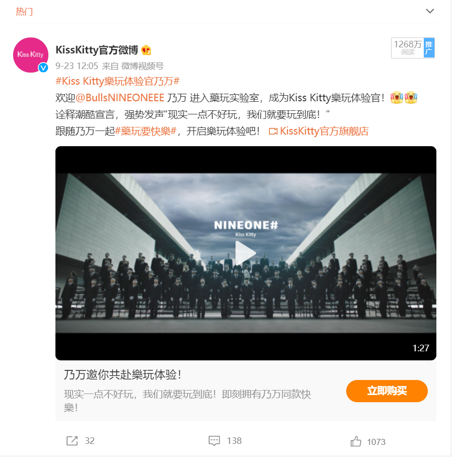 揭晓当日,品牌与明星本人相继发布官宣微博,话题#藥玩要快樂#、#Kiss Kitty樂玩体验官乃万#正式上线。在官宣时,Kiss Kitty找准明星与新品间的核心连接点“樂玩体验”,正向声量迅速攀升,微博话题总曝光高达1亿+,总互动量突破14W+。