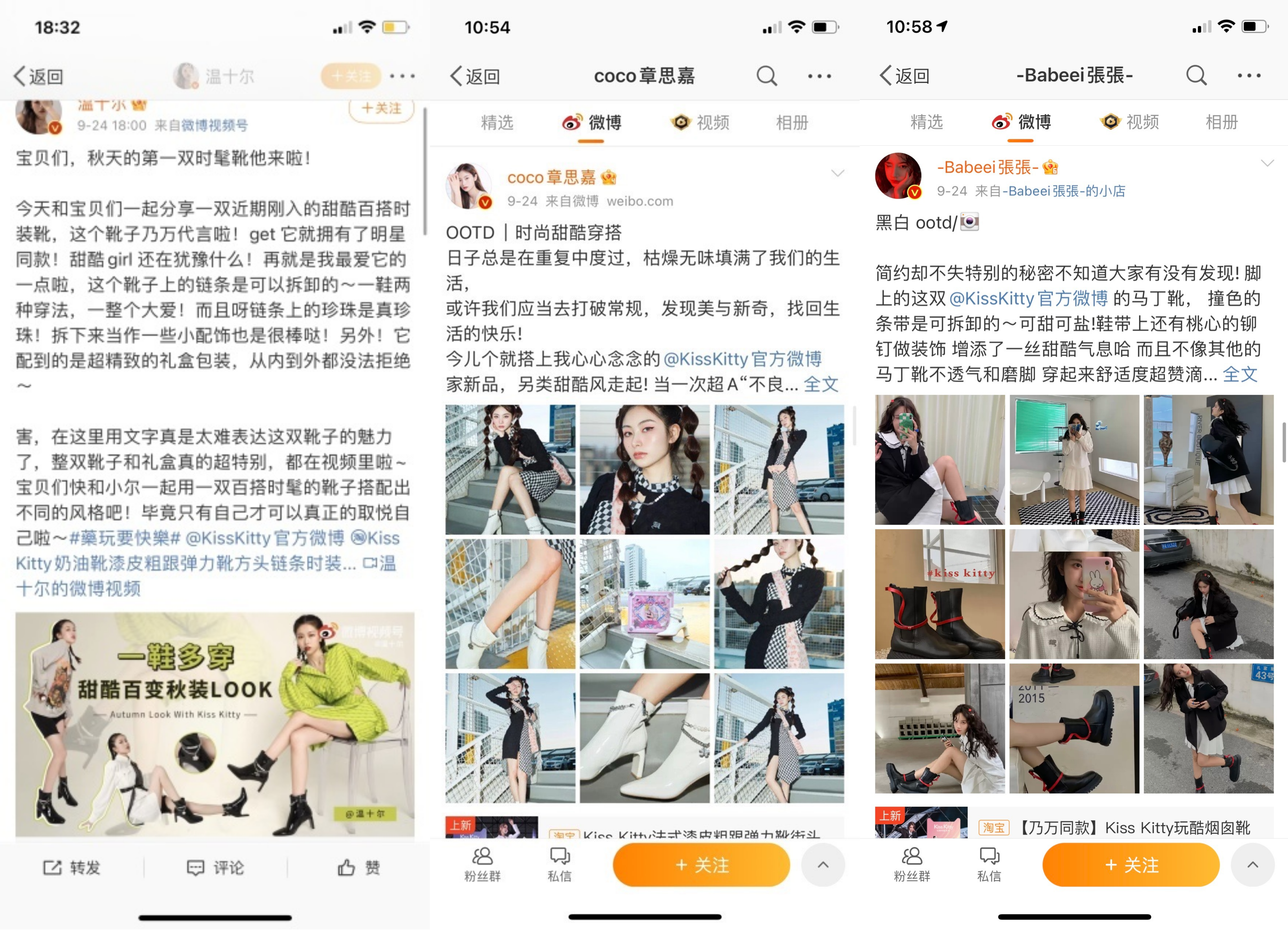 除双方联动官宣外,Kiss Kitty还吸引到微博时尚大V和小红书时尚KOL共同为新品发声,秋冬新品火速占领粉丝心智,从而收获众多优质用户UGC自发宣传,引发众人对Kiss Kitty产生好感。