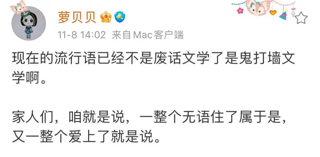 看完是不是蚌埠住了!自媒体人@萝贝贝 将其形容为一种“鬼打墙文学”。简单来说就是表述者有意而为之的一种“模糊不清的、绕来绕去的、原地打转的、反复重复的、让人摸不清头脑的”长段表达,多少含有恶搞、趣味、无厘头的成份。