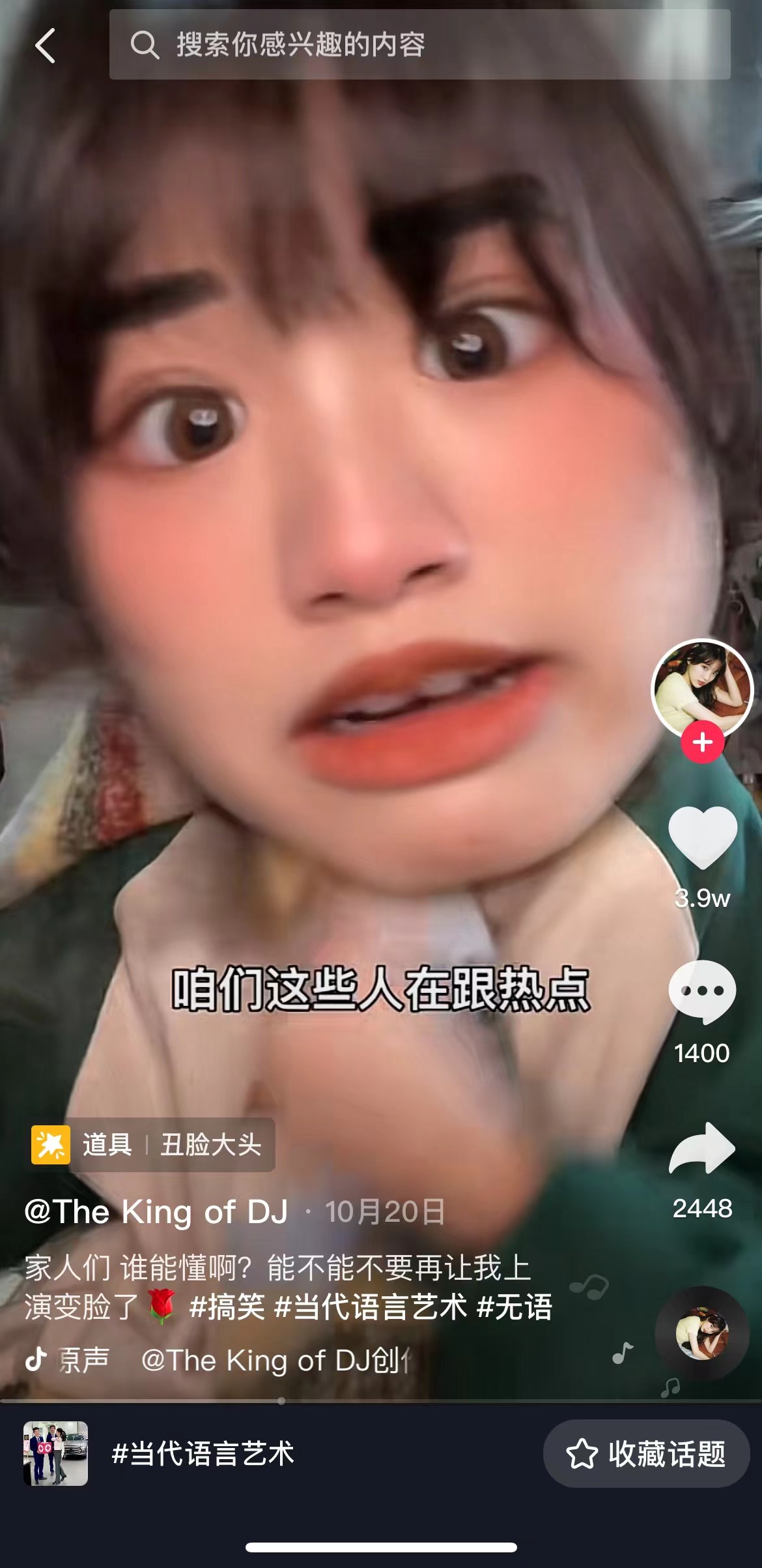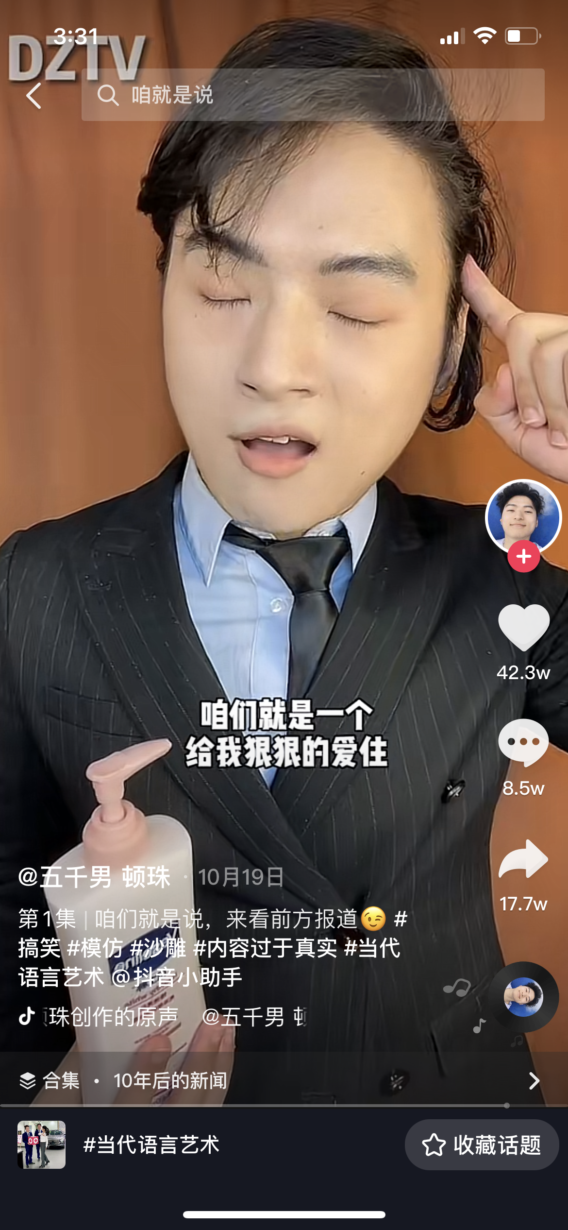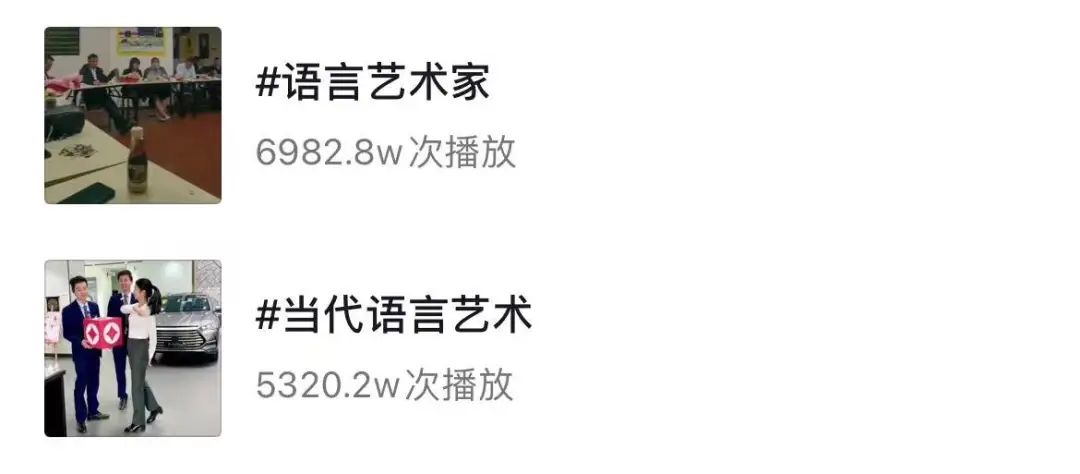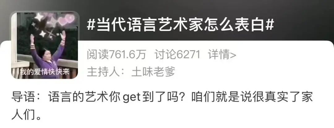 在抖音上,话题#咱就是说#、#语言艺术家#和#当代语言艺术#都达到了千万级播放量;在微博上,#当代语言艺术家怎么表白#的话题火了。
