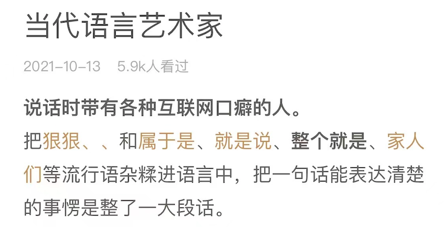 而“当代语言艺术家”话语体系所夹杂的“狠狠”、“就是说”、“整个就是”、“家人们”等词语,看似无厘头、鬼打墙,实则字字饱含种种情绪的表达。