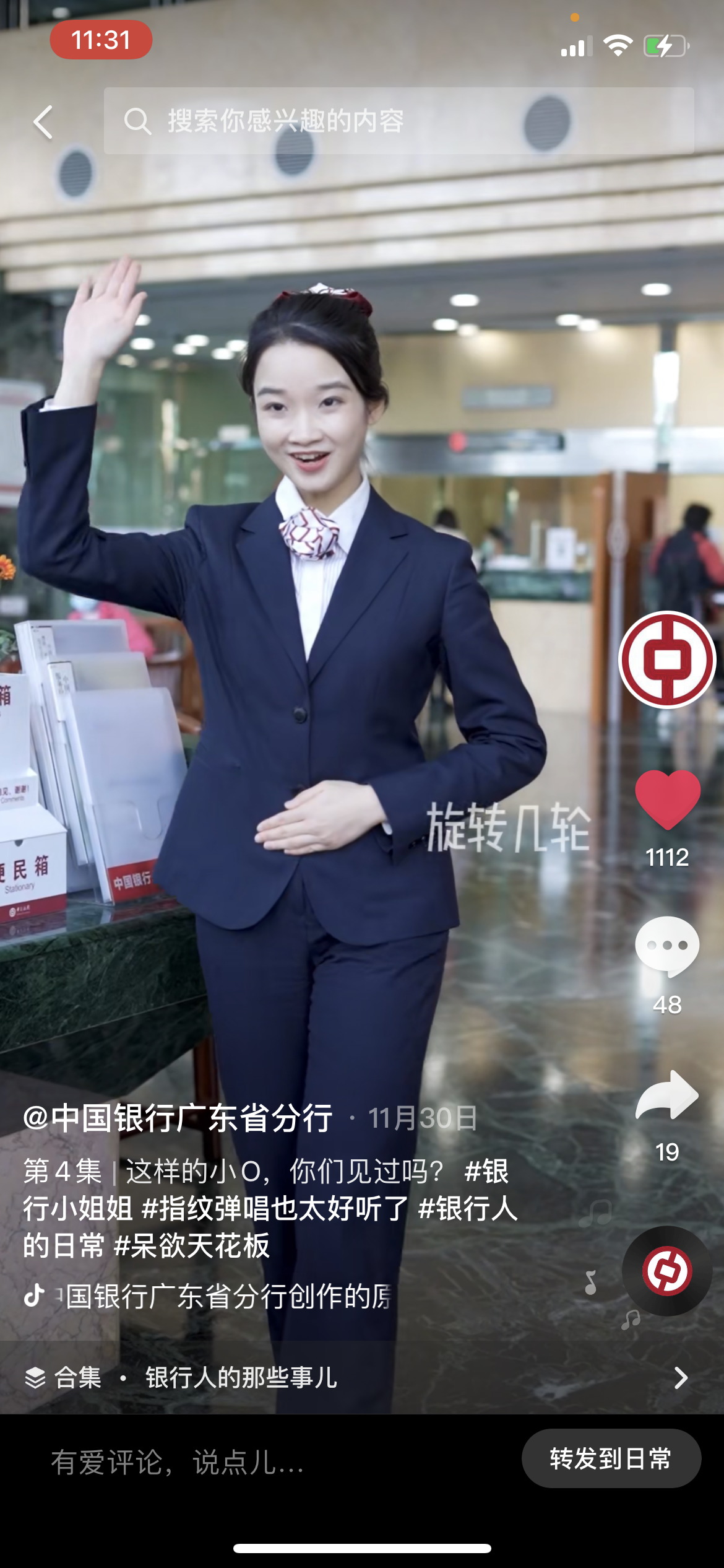 中国银行这边,广东省分行的官抖让“呆欲系”员工出镜当主角,演绎《银行人的那些事儿》系列的最新一集。