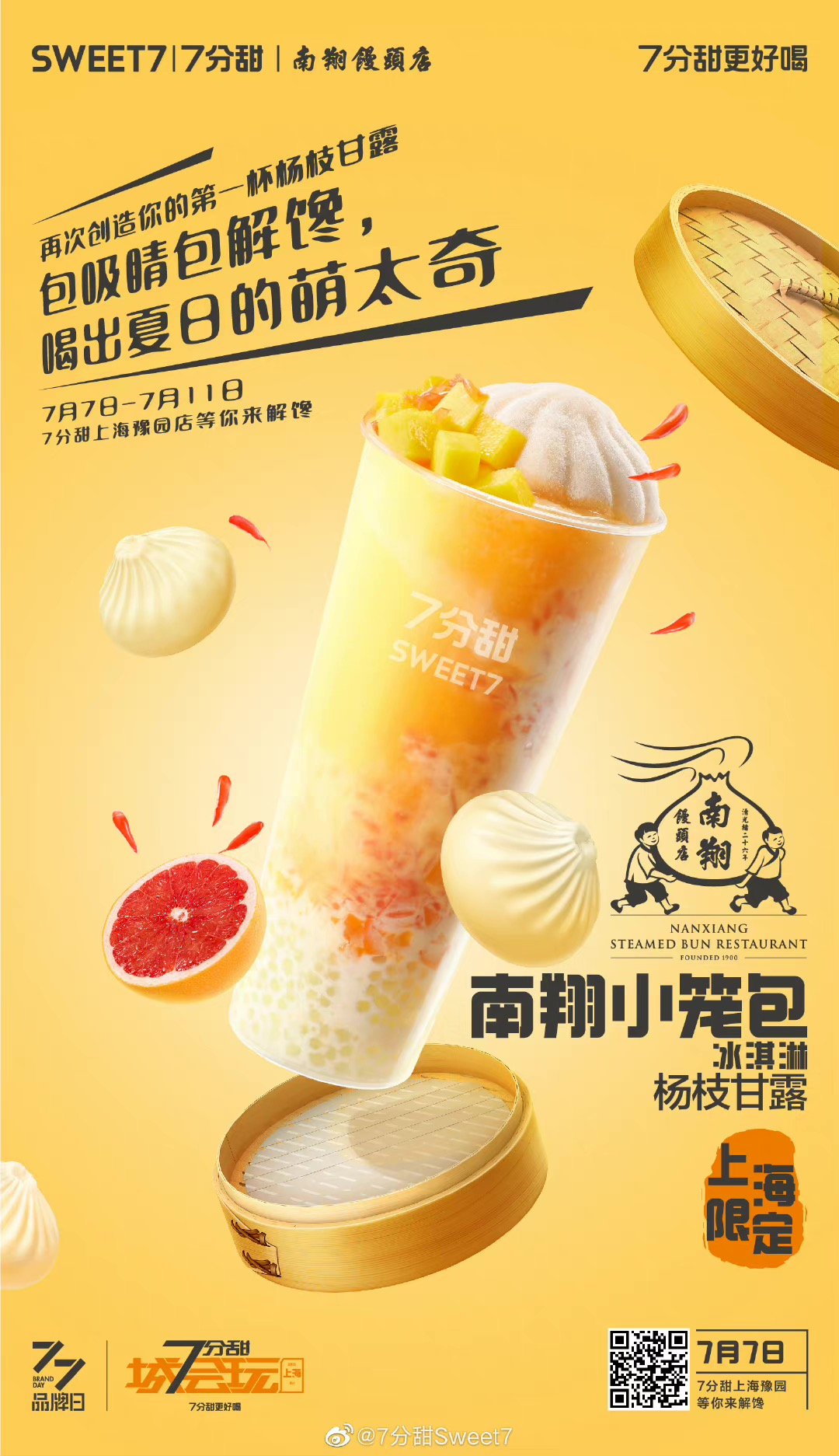还有7分甜与南翔小笼包联名的“小笼包杨枝甘露”,裹着一层芒果冰的小笼包,想不想来一口?